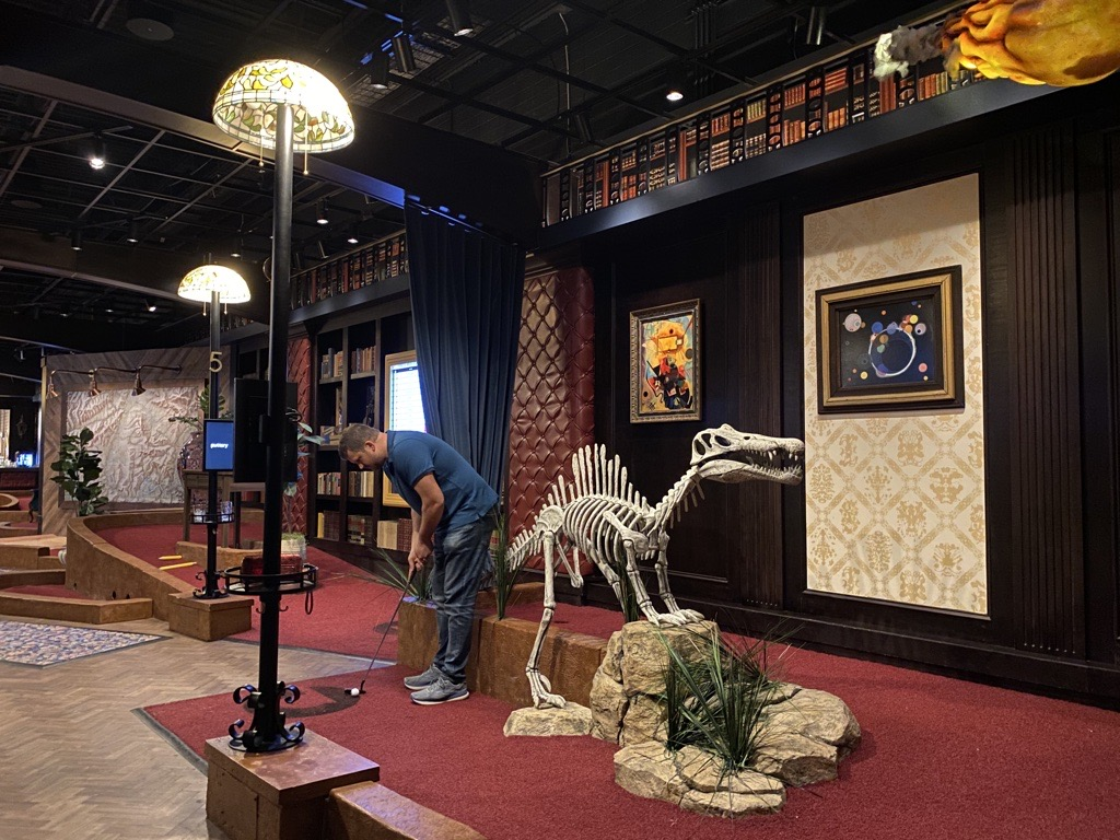 Worth a visit for the experience. We had a great time overall and food/drinks were good. Service was a bit slow but it's a popular place, so be patient with their team and just relax and enjoy your company. The entire place has a great vibe, lots of great and different seating (tables, couches, big chairs, swinging chairs, bar seating) so you can post up and have a drink or some food while you wait for your tee time. Both courses are 9 holes each and fun to play. They have a "Conservatory" side (think indoor garden/forest landscape) and a "Library" side (think mahogany, plush couches, leather bound books). All holes range in difficulty and like with any putt putt course you may play faster than the group ahead of you. The score tracking at each hole is tracked through a tablet present at each hole. As you play you can electronically enter in scores and your scorecard will automatically appear at the next hole on the next tablet. The top players for the day will appear on one larger TV screen located along the course. There are individual bars on each course and puttery representatives that can get you more drinks as you play or you can walk up to the bar on the course you choose. Overall a lot of fun and we'd go back with friends.