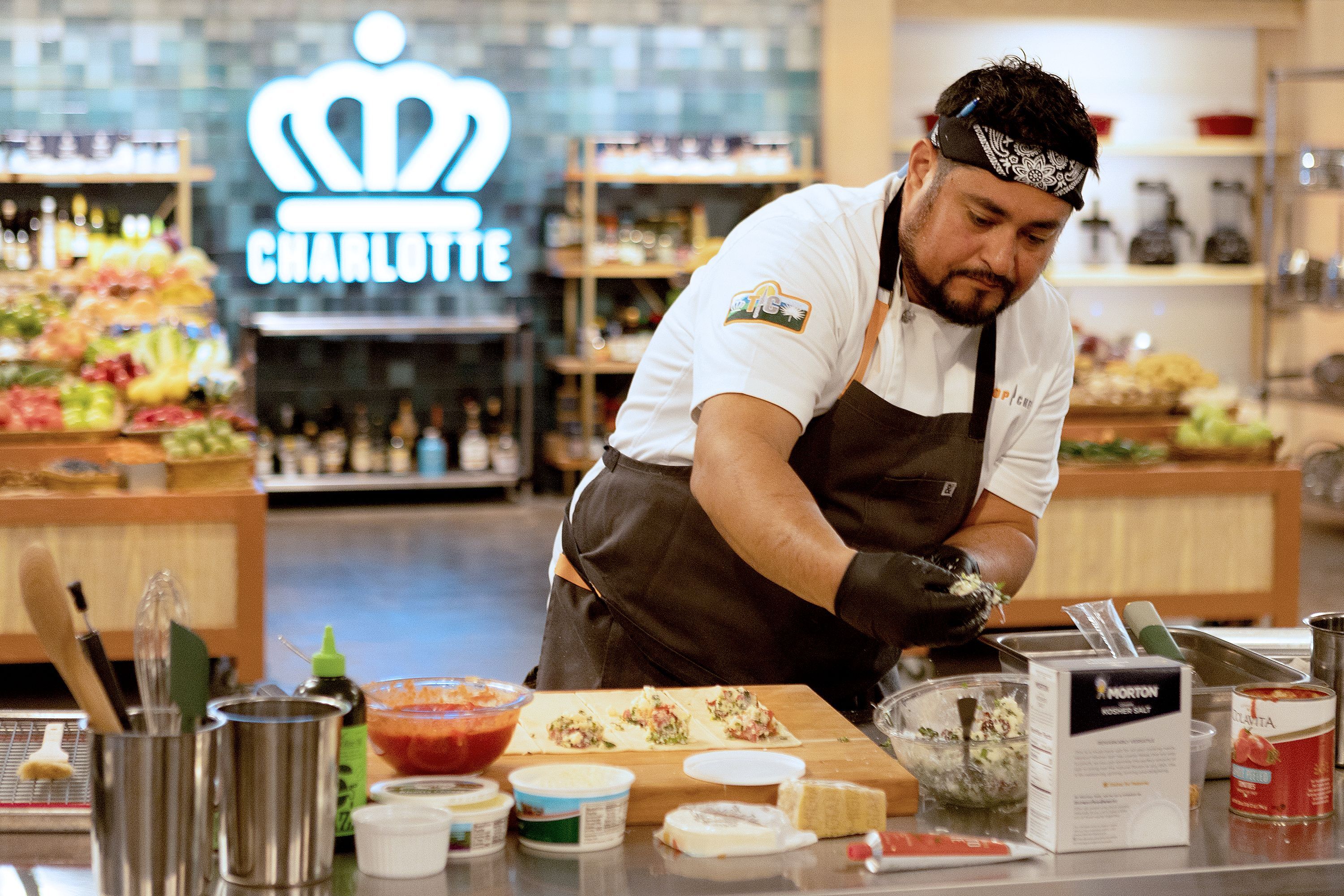 Using natural food-dyed elements, the chefs had to create vibrant dishes to pay homage to Charlotte’s rich textile history. After shopping at a Whole Foods in southeast Charlotte, the chefs returned to the kitchen to begin their colorful cooking.