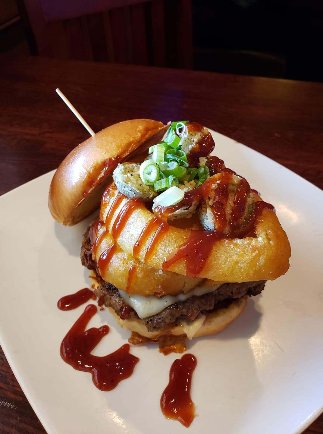 4 Stars!! This was a last-minute dinner idea as traffic took out our primary. We thought it would be a closer option on the way home. Sure, it was closer, but I had no idea that this road gets so congested after 4:30 pm. Be sure to consult your traffic app before attempting this place. Its a pub so be aware that the noise level is going to be higher than you would expect at a restaurant. They do have a large outdoor area for big groups which is partially covered. It had started to rain when we arrived so chose the inside option. There is a long bar with a tv flashing the beer listings. We arrived during the happy hour, but since we were both driving, we passed on the beer. I really want to try the blackberry lemonade ale YUM. We started off with the buffalo chicken egg rolls and OMG. So Good! I could have just eaten those as an entre. The chicken has a paste like consistency, but it has the right level of buffalo flavor that you completely miss that. Our server arrived with food. I had the philly while The Man had a specialty burger but cant remember the name. To his credit, they do have a long list of burgers. He liked the garlic aioli which they put on the side with his house chips. He also admitted that it was a burger but not a standout. The Philly wasnt the best, I will admit. Part was shaved and part was chunky. I dont know if it was left over steak, but it was a little tough. Im picky about cheesesteak but I still try to find one that is yummy. Since we were both out of sorts due to the entrees, we chose the caramel cheesecake. Very Good. It has the sweet from the caramel whipped together with the silky texture of the cheesecake. Our server was tip top!!! She was bringing us new glasses when ours got to the halfway mark. She was moving quick but we never got the hated rushed feeling. Excellent!!! All in all, it was a good experience. The crowds were coming in when we got there and when we left. It is obviously very popular and spacious for people to move around. We may go back but not during happy hour lol.