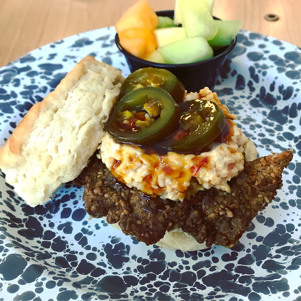 We had a great experience at this place! The staff were friendly and helpful. I adventurously chose the Pork Rambler. It's a slice of pork tenderloin with blackberry butter and onion straws served on a biscuit. I suppose you could pick it up and eat it but I went at it with a knife and fork. It was delicious, for sure!