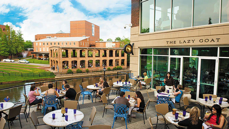 Situated on the banks of the Reedy River in downtown Greenville, The Lazy Goat offers a vibrant, urban eatery perfect for gathering, conversing, and relaxing. Diners flock for the sweeping views of the city, the people-watching from the open-air patio, and the rustic Mediterranean-inspired cuisine. It’s easy to sink into the restaurant’s comfortable ambiance while imbibing on a fun cocktail, or glass of wine and noshing on plates of shareable dishes like the Fried Goat Cheese or the robust Charcuterie plate.